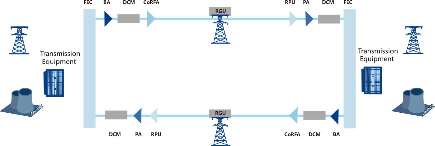 对于超长途光纤通信系统,传统的通信方式是在线路中设置中继站,在中继站中对光信号进行放大定型后再传输。然而,工业专网尤其是电力系统的传输线路线通常较偏僻,要经过沙漠、山脉等恶劣地区,很难找到合适的光学中继站。此外,沿线独立光中继站的建设还需要新建基础设施(包括土建、电气、消防、暖通等),在建设过程中会受到选址、征地、外部电源、施工条件等诸多因素的影响,投入运行后机房电力环境、外部电源、进光电缆、光传输设备等也会影响通信电路的可靠性。超长距离光传输技术具有端到端直接接入、无需中继设备、运行维护成本低等特点。系统产品采用超长途光传输技术,有效实现远距离直接通信,减少中继站故障,提高线路运行的稳定性和安全性。